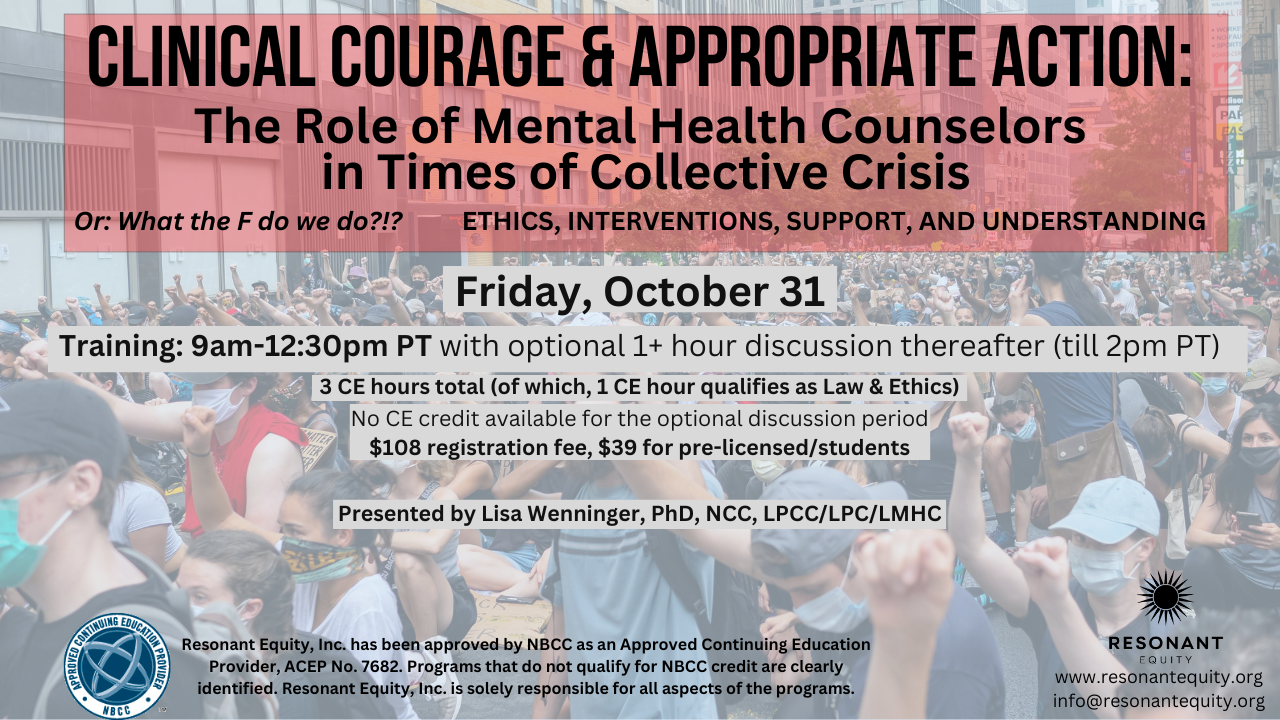 Resonant Equity, Inc. has been approved by NBCC as an Approved Continuing Education Provider, ACEP No. 7682. Programs that do not qualify for NBCC credit are clearly identified. Resonant Equity, Inc. is solely responsible for all aspects of the programs. |