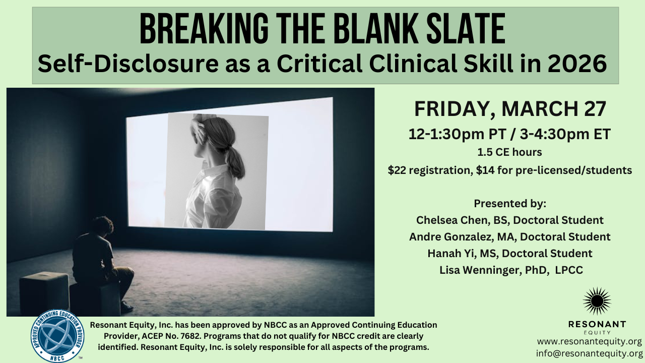 Resonant Equity, Inc. has been approved by NBCC as an Approved Continuing Education Provider, ACEP No. 7682. Programs that do not qualify for NBCC credit are clearly identified. Resonant Equity, Inc. is solely responsible for all aspects of the programs. |