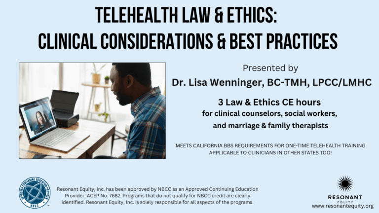 Resonant Equity, Inc. has been approved by NBCC as an Approved Continuing Education Provider, ACEP No. 7682. Programs that do not qualify for NBCC credit are clearly identified. Resonant Equity, Inc. is solely responsible for all aspects of the programs. |