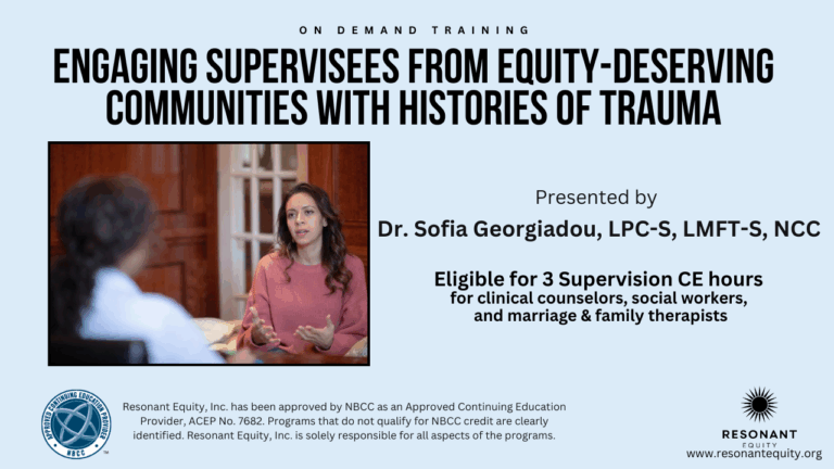 Resonant Equity, Inc. has been approved by NBCC as an Approved Continuing Education Provider, ACEP No. 7682. Programs that do not qualify for NBCC credit are clearly identified. Resonant Equity, Inc. is solely responsible for all aspects of the programs. |